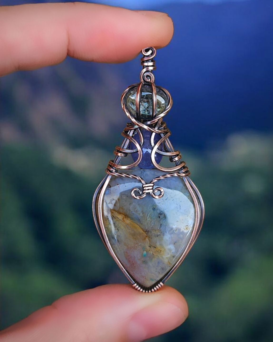 Agaat en paarse+ groene tanzaniet antiek koper wire wrap hanger (PRE-ORDER / de helft aanbetaling van 135)