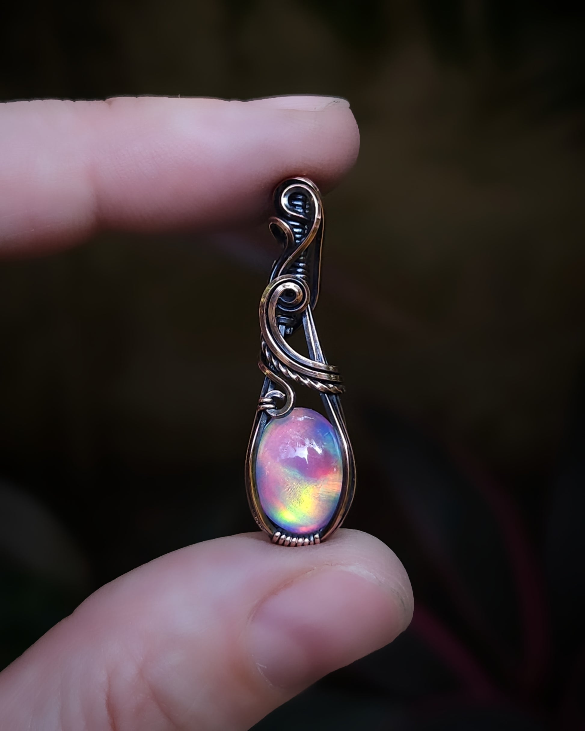 Aurora opaal (manmade) antiek koper wire wrap hanger