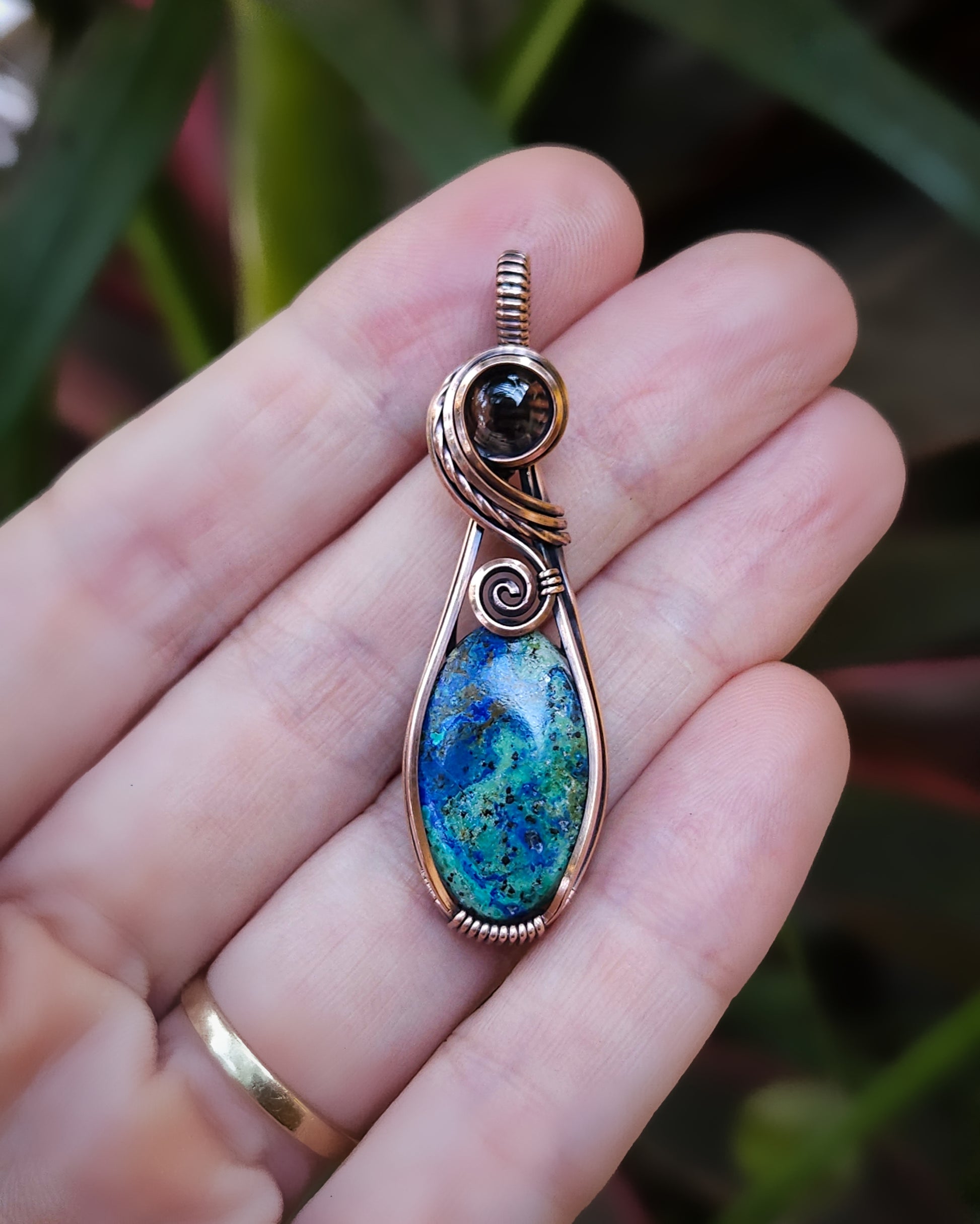Azuriet en rookkwarts antiek koper wire wrap hanger