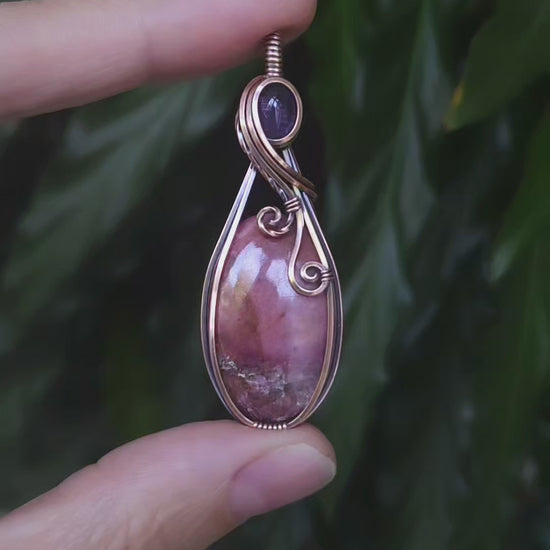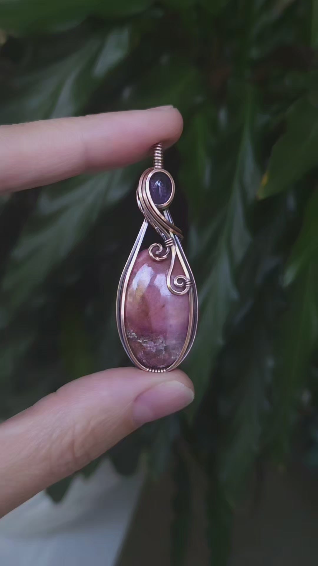 Cobalt calcite and amethyst antique copper wire wrap pendant