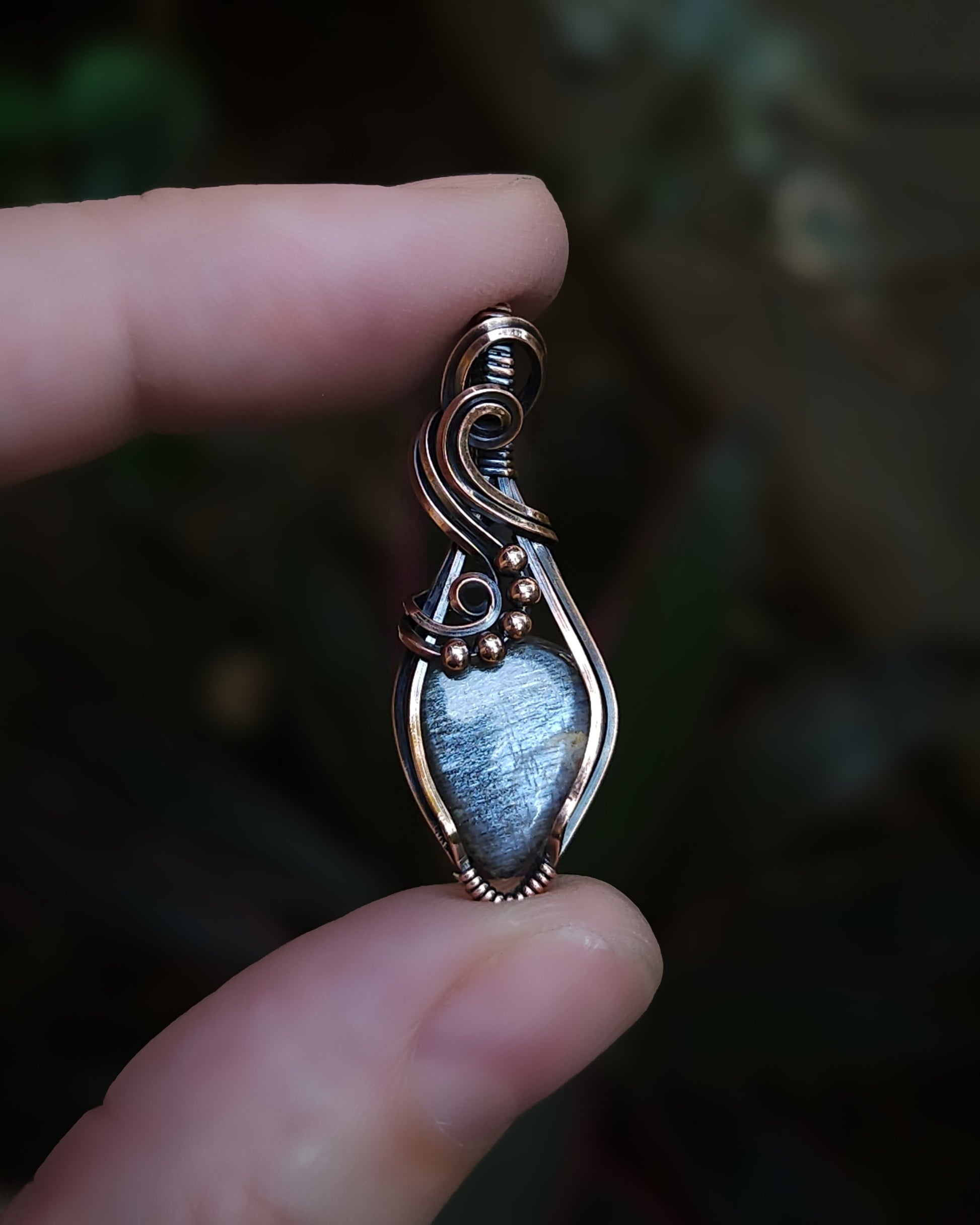 Grijze maansteen antiek koper wire wrap hanger