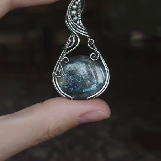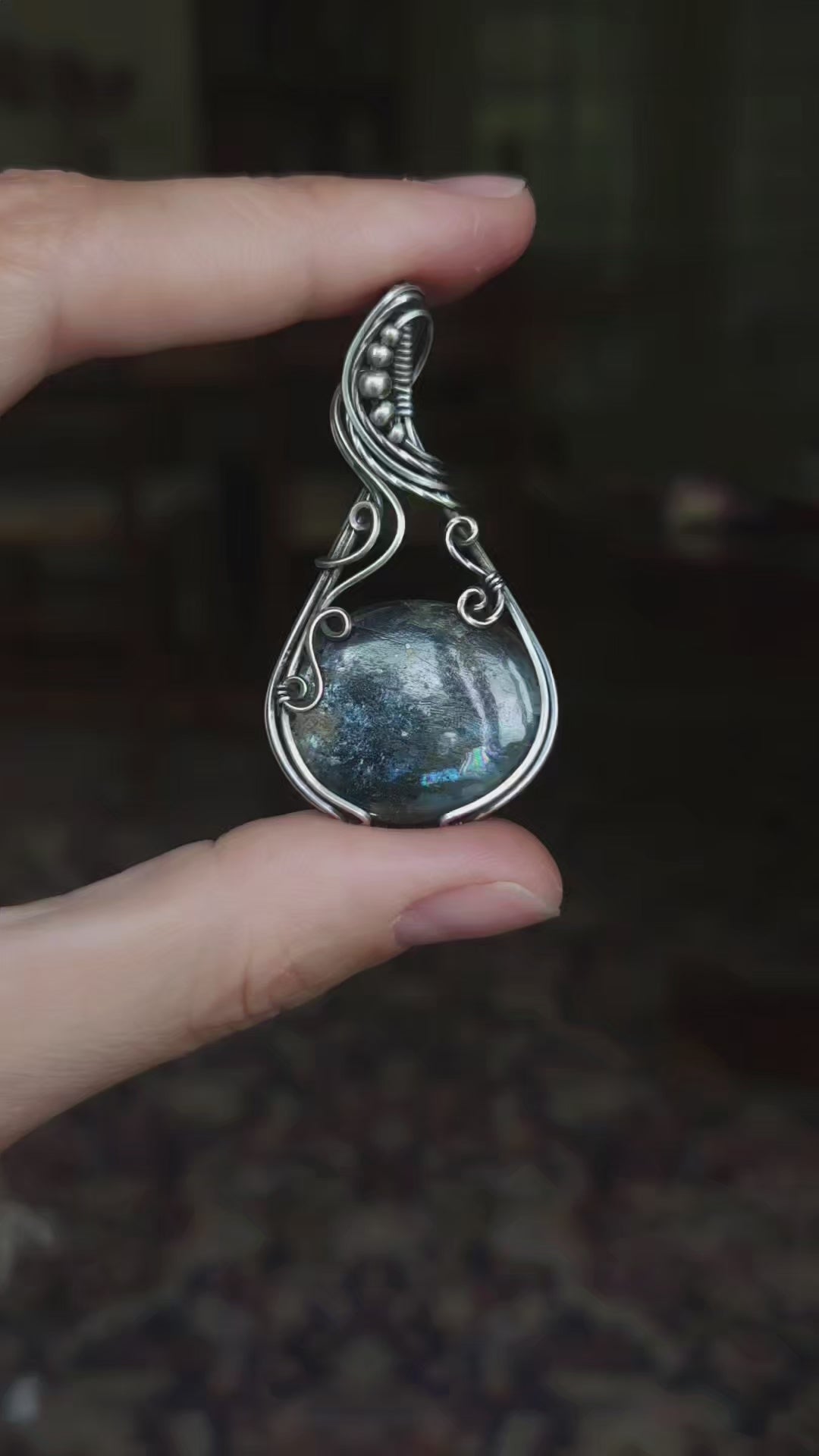 Wrapped in a fairy design with 925 sterling silver wire, oxidized and polished for an antique look.