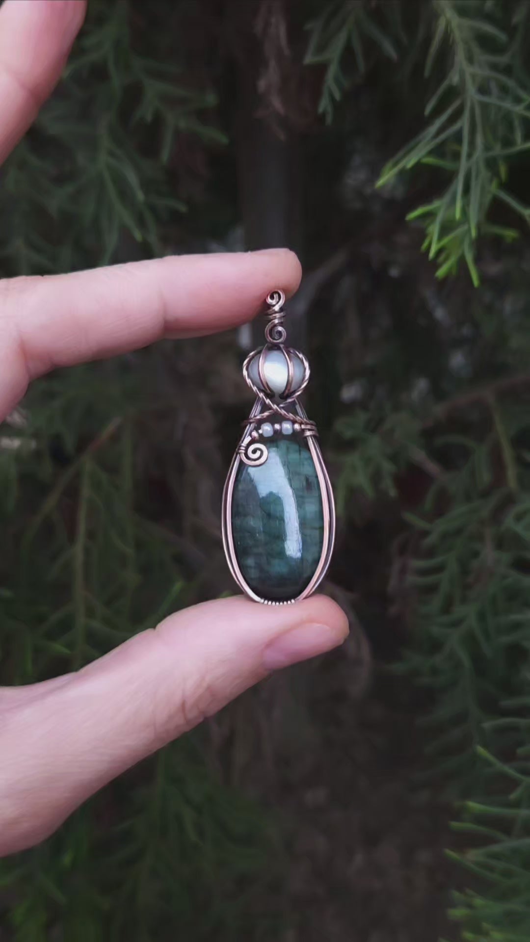 Smaragd en witte maansteen antiek koper wire wrap hanger