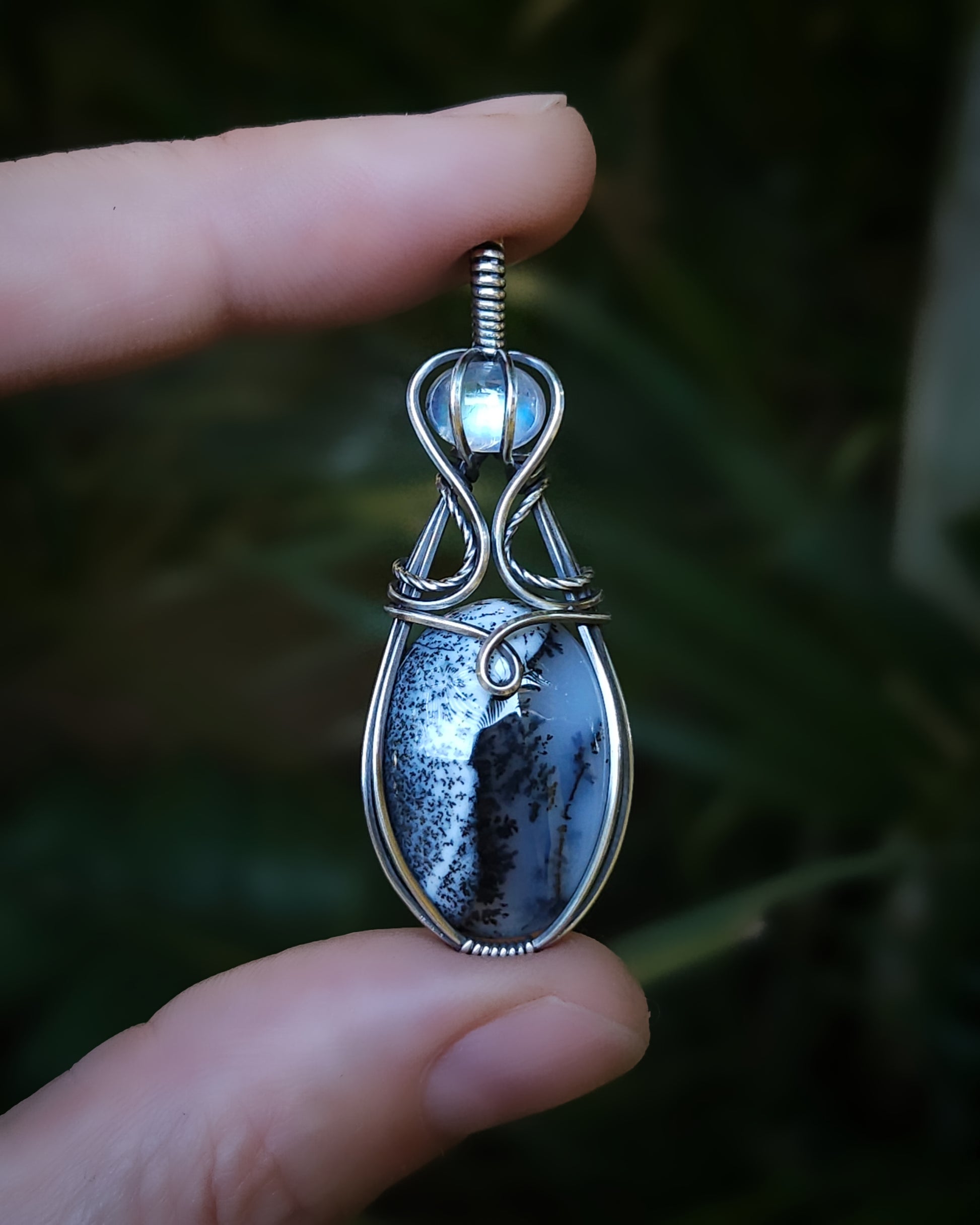 Dendritisch opaal en regenboog maansteen antiek 925 sterling zilver wire wrap (PRE-ORDER / de helft aanbetaling van 120)