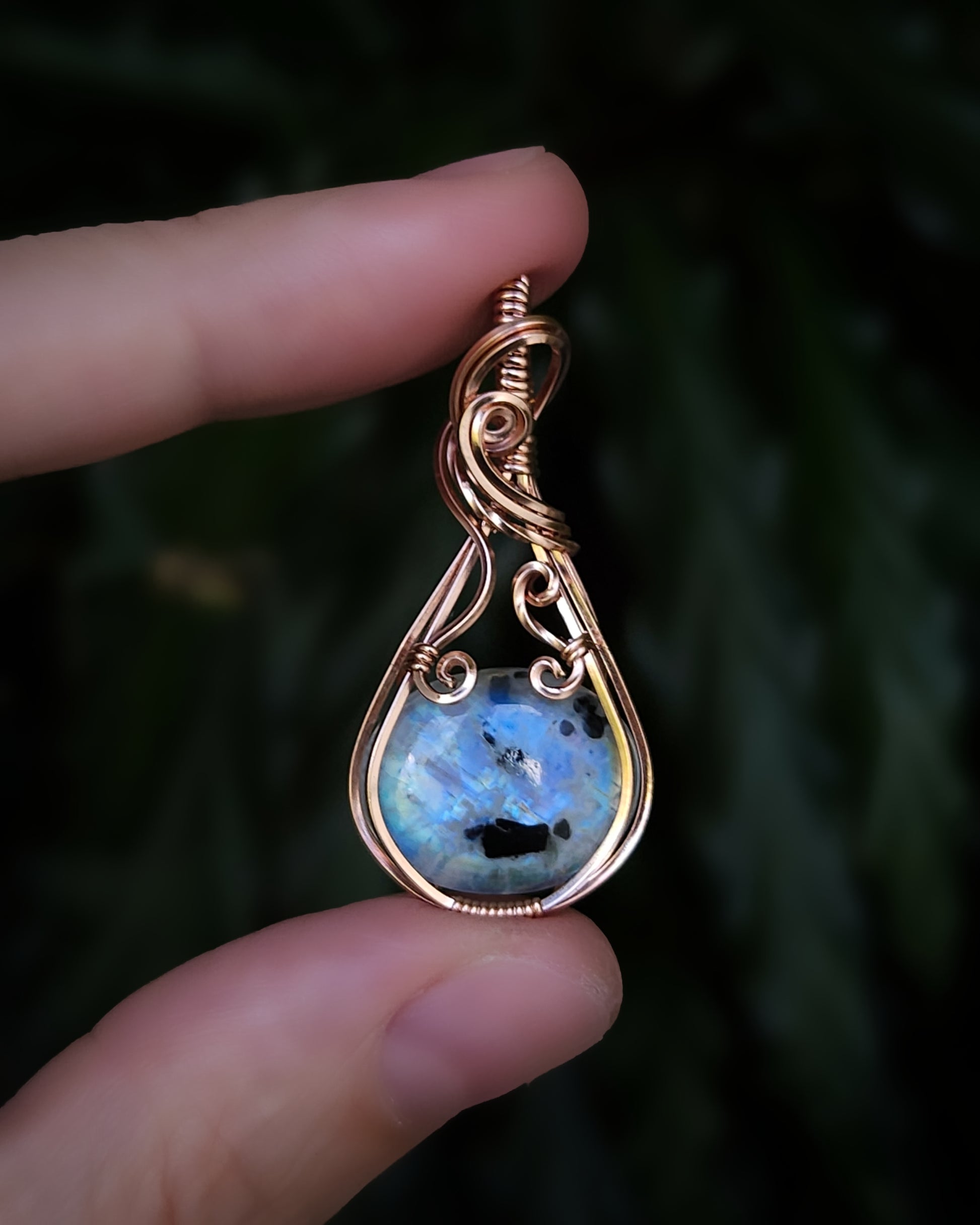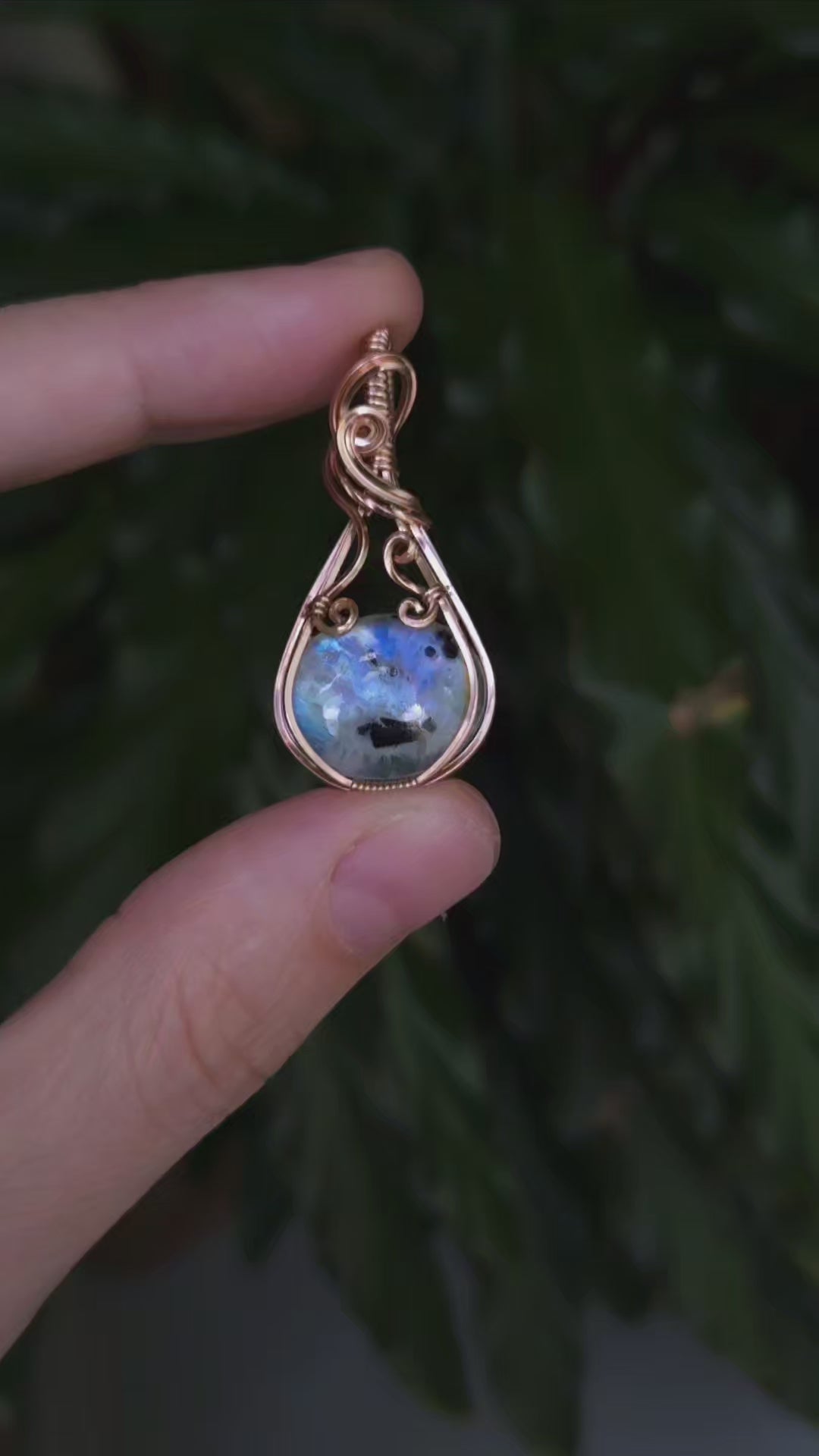 Regenboog maansteen met toermalijn inclusies 14k rose goldfill wire wrap hanger